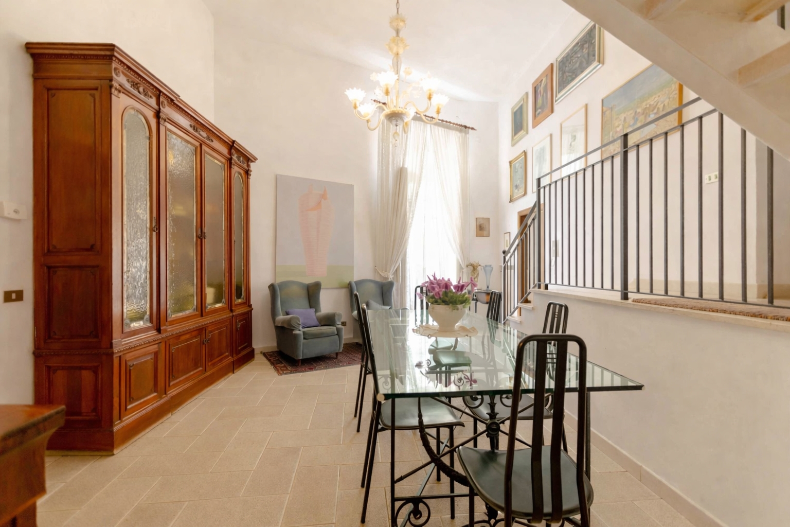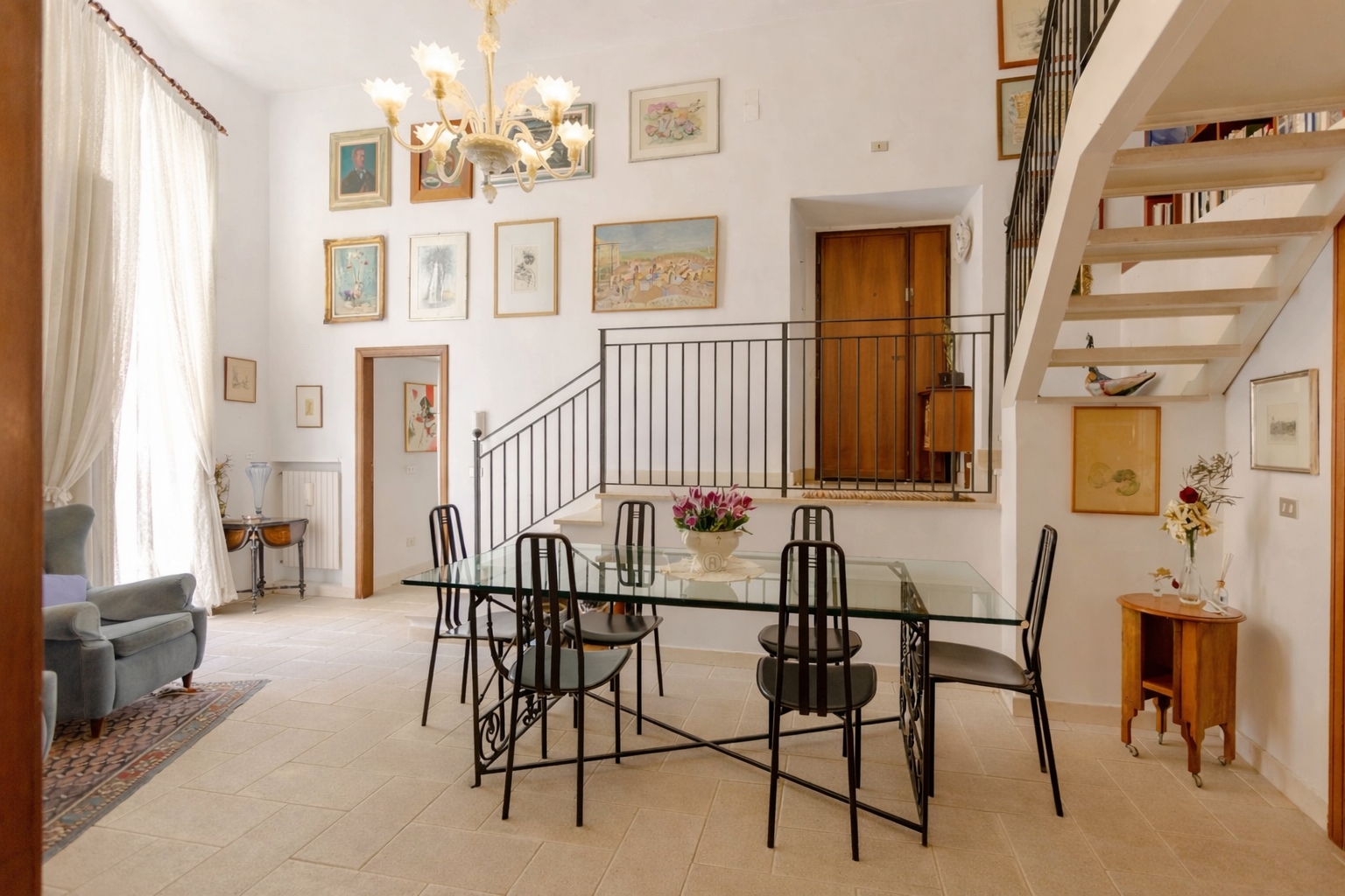 Varcando la soglia, si viene accolti da una zona giorno di forte impatto scenografico, caratterizzata da volte imponenti alte circa cinque metri e da un elegante gioco di soppalchi che creano profondità, movimento e una straordinaria sensazione di ariosità. La luce naturale diventa protagonista assoluta, avvolgendo ogni spazio.
