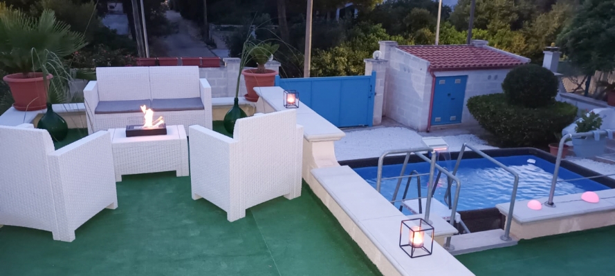 L’ingresso alla villa avviene attraverso una splendida veranda coperta con vetrate apribili, uno spazio versatile da vivere tutto l’anno, arricchito da un tradizionale forno a legna, perfetto per cene conviviali e momenti di autentica convivialità mediterranea.