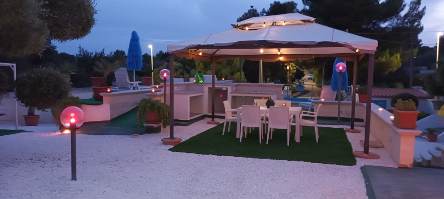 Gli spazi esterni sono pensati per vivere appieno il relax e il divertimento piscina fuori terra, area barbecue attrezzata, due zone bar con solarium, due bagni con docce interne ed esterne, due ripostigli e box auto coperto.