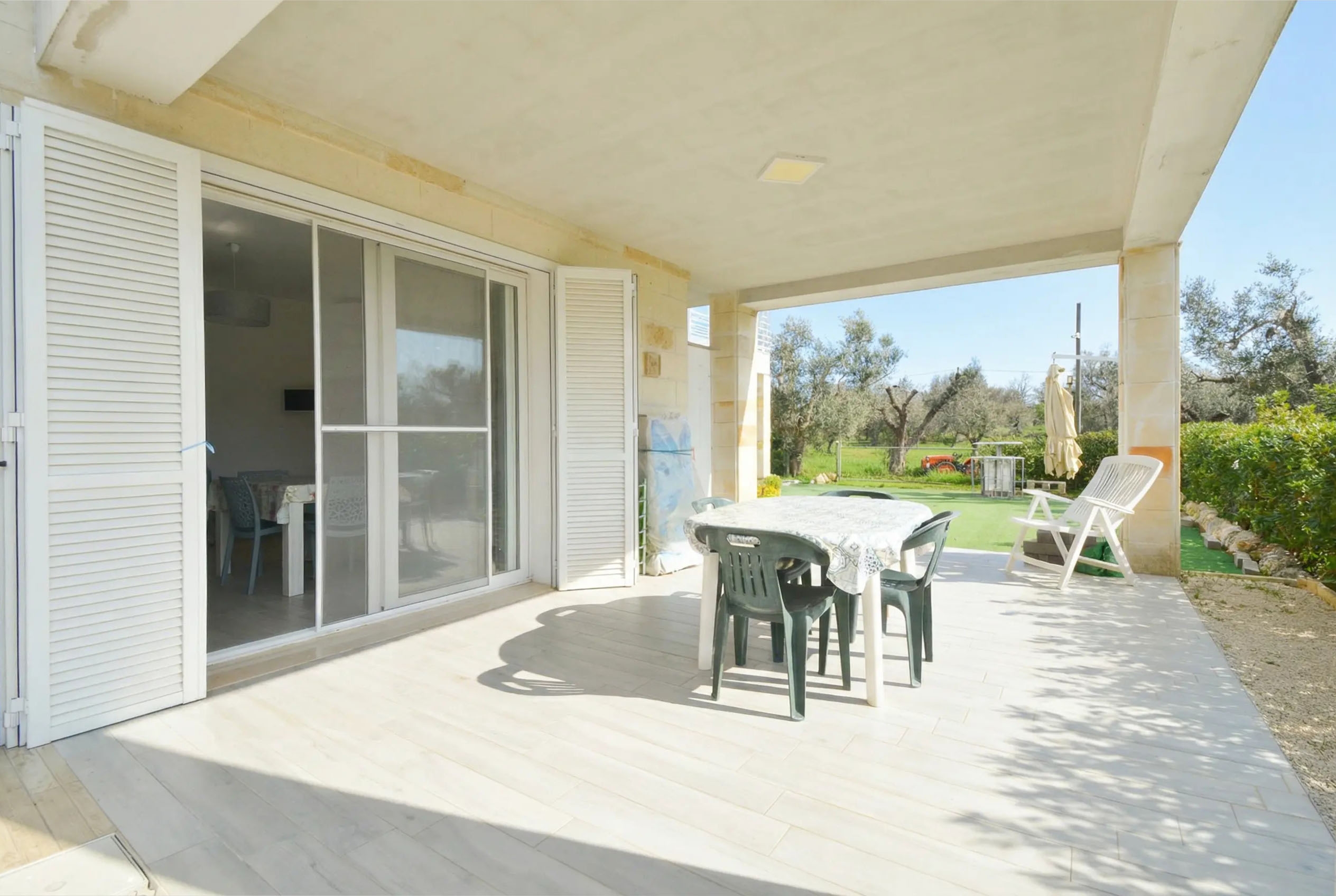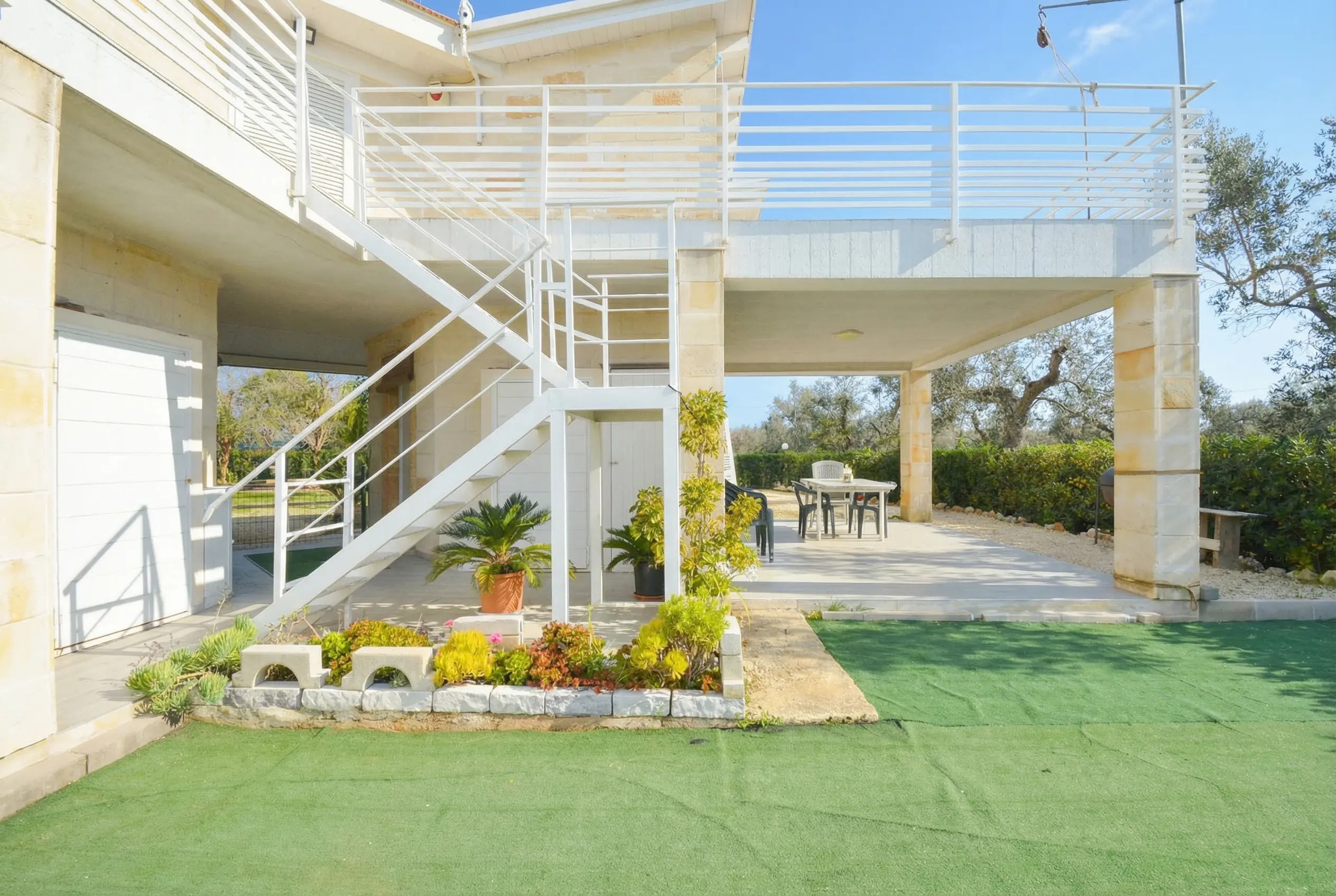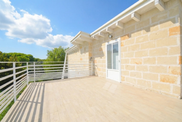 È posta su due livelli, immersa nel verde, con terreno circostante di 10000mq piantumato da alberi di ulivo, frutto e vigneto.